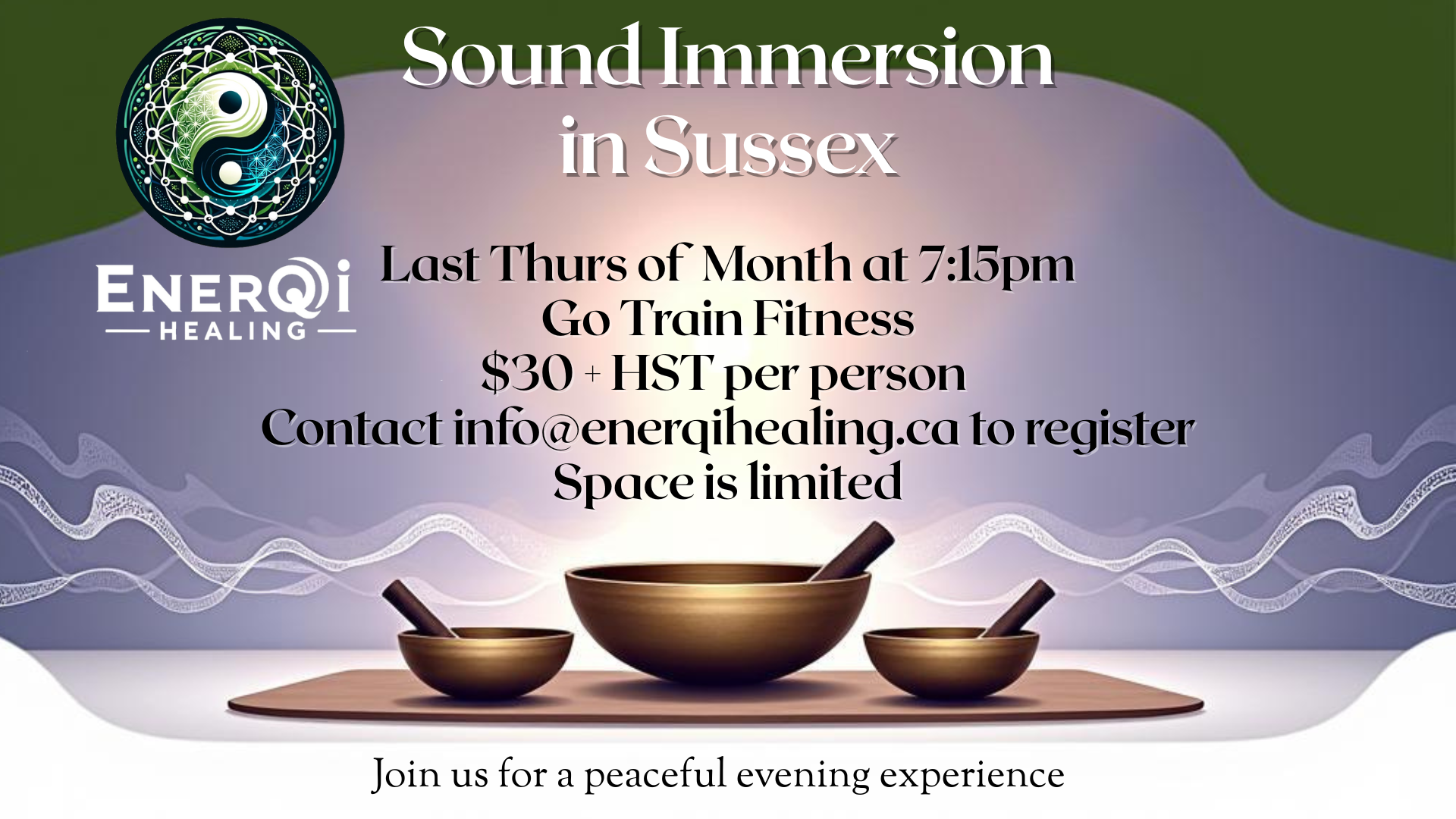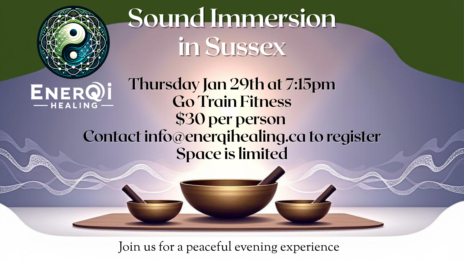 GO Train Fitness 7 Peter St, Sussex, New Brunswick, CanadaSOUND IMMERSION EXPERIENCE RETURNS TO SUSSEX Join Mike Borgh of EnerQi Healing, for a transformative Sound Immersion journey that will soothe your mind, body, and soul through the healing vibrations of ancient instruments. WHEN: Thursday Feb 26th @ 7:15 pm. Doors open at 6:45 and close at 7:15 pm. WHERE: Go Train Fitness, 7 Peter St, Sussex […]