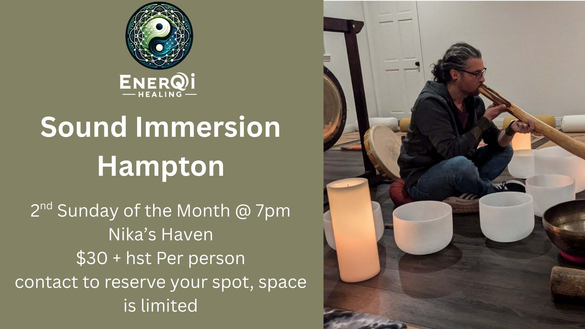 Nika's Haven 966 Main St, Hampton, New Brunswick, CanadaSOUND IMMERSION EXPERIENCE RETURNS TO HAMPTON Join Mike Borgh of EnerQi Healing, for a transformative Sound Immersion journey that will soothe your mind, body, and soul through the healing vibrations of ancient instruments. WHEN: 2nd Sunday of the month @ 7pm WHERE: Nika's Haven, 966 Main St, Hampton COST: $30 + hst per person LIMITED SPOTS AVAILABLE! Reserve […]